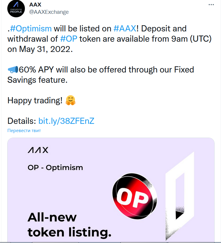 Так, согласно информации от AAX, с вечера 31 мая платформа начала поддерживать пополнение счетов клиентов и вывод средств в токенах OP, а также торговые пары с участием OP.