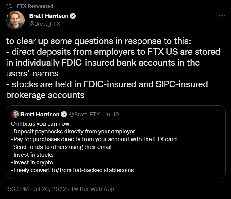 Тем временем президент FTX US Бретт Харрисон, похоже, пытается заверить клиентов торговой площадки, что все средства находятся в сохранности. Он заявил у себя в твиттере, что зарплаты работодателей своим работникам через биржу застрахованы Федеральной корпорацией по страхованию вкладов (FDIC). То же самое касается и акций, отметил он.