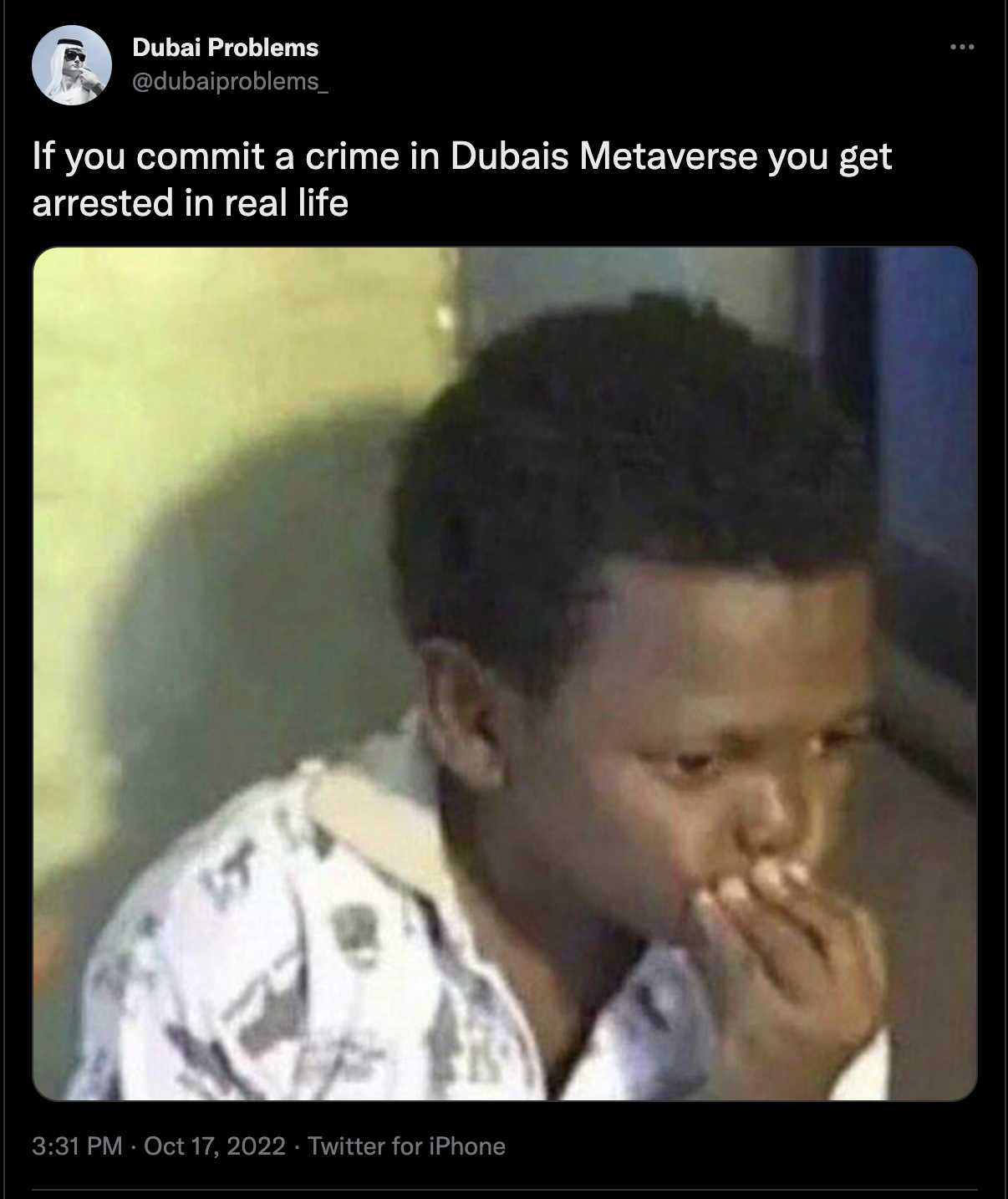 Подпись: «Если совершишь преступление в дубайской метавселенной, тебя арестуют в реальной жизни»