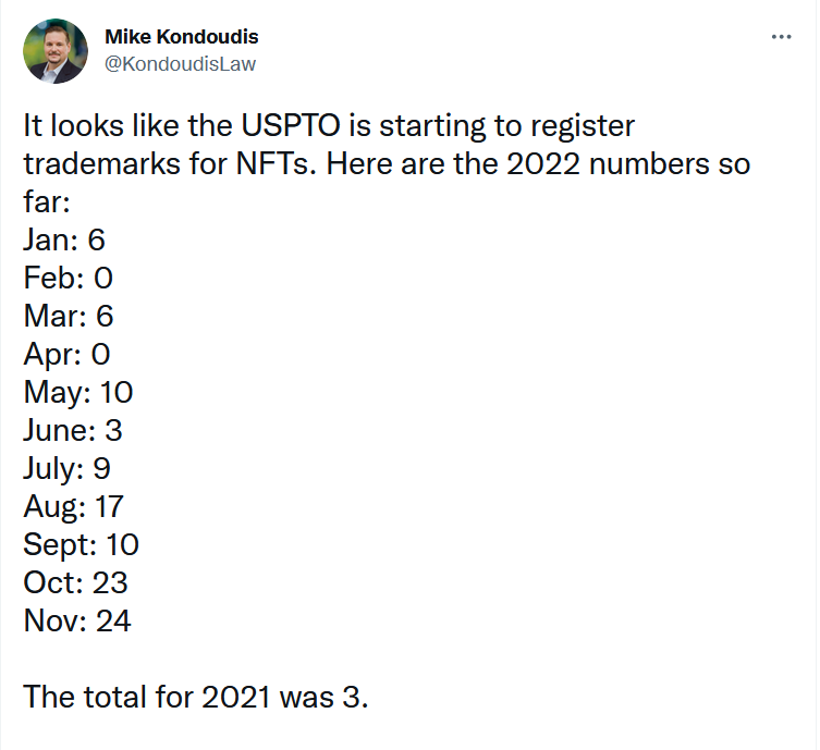 За этот же месяц Бюро по регистрации патентов и торговых марок США (USPTO) зарегистрировало рекордные 24 товарных знака, имеющих отношение к токенам NFT и связанным с ними услугам. Для сравнения, за весь 2021 год было зарегистрировано всего 3 таких торговых марки.