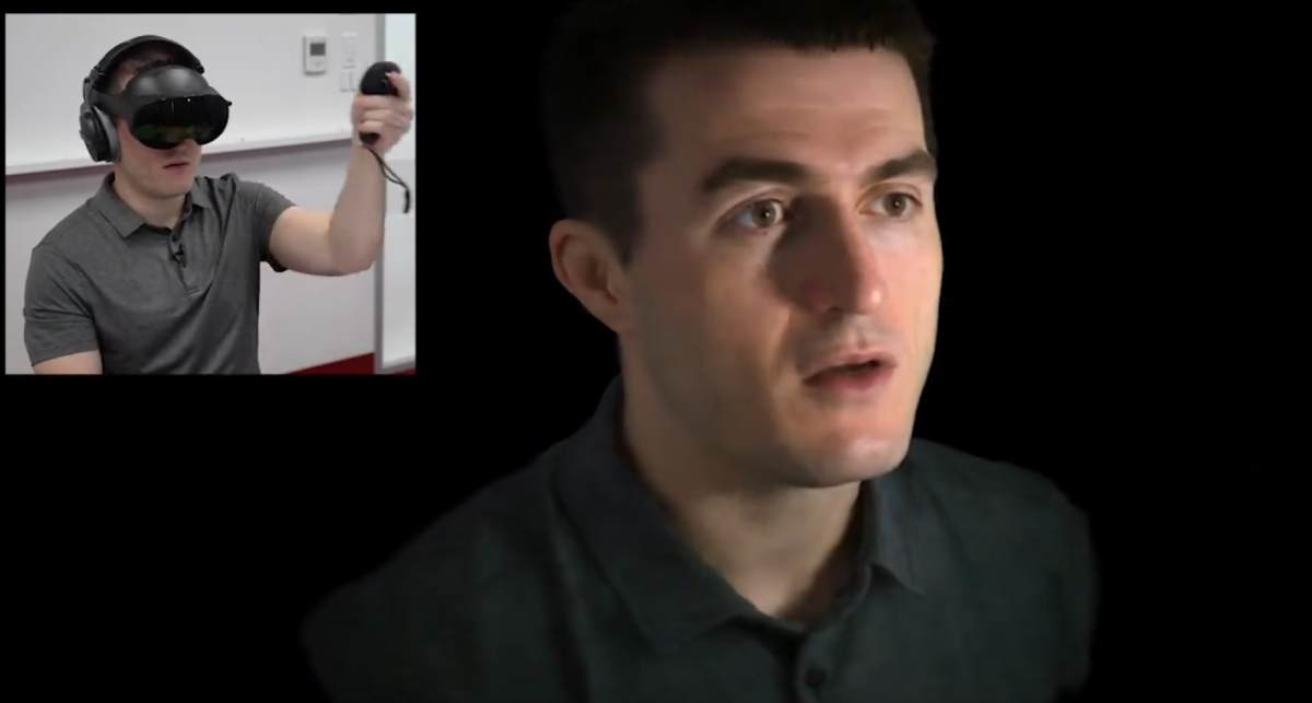 Фридман в очках и его аватар на большом экране, разработанный Reality Labs