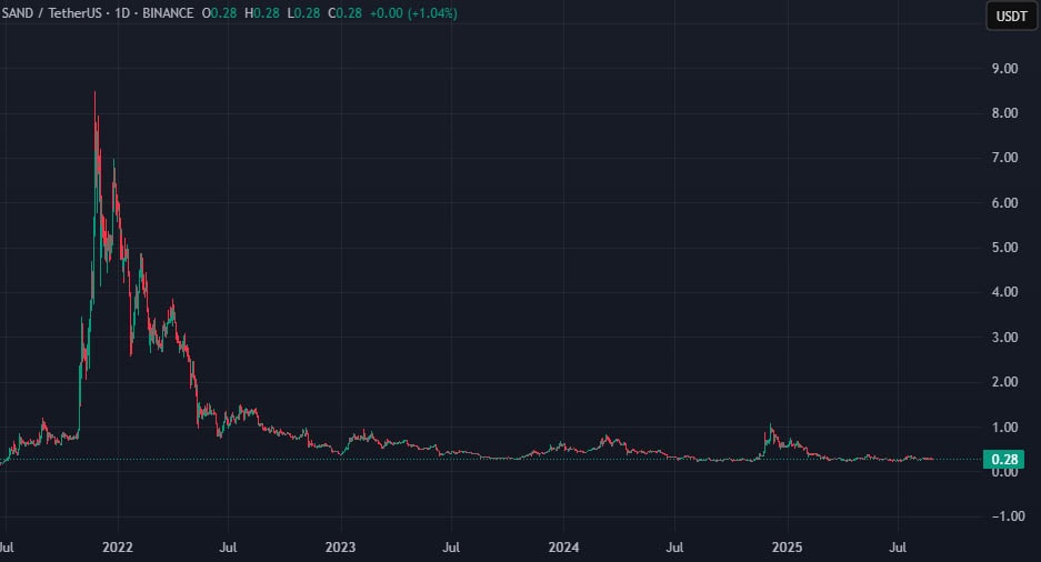Отметим, токен проекта SAND обвалился на около 97% от его исторического максимума. На момент написания статьи актив торгуется вблизи отметки в $0,28: