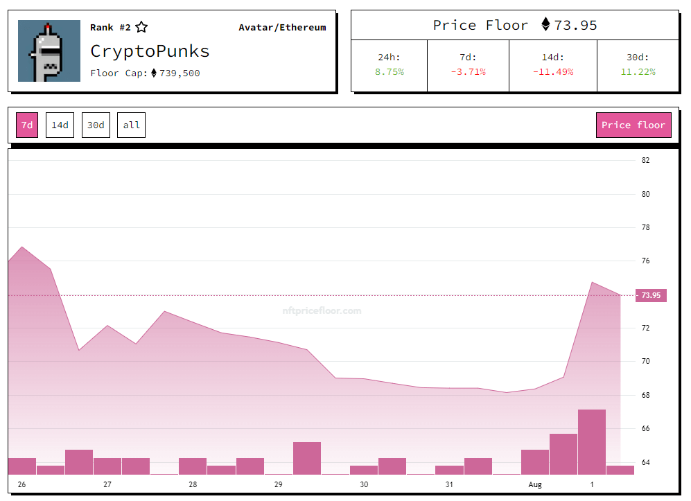 Каждый токен NFTiffs стоит 30 ETH: в эту цену входит выпуск NFT к кулону, сам кулон и цепочка, а также доставка и обработка изделия. Старт продаж NFTiffs назначен на 5 августа. На данный момент минимальная цена токена из серии CryptoPunks составляет 73.95 ETH. То есть любители ювелирных изделий должны заплатить около 125 тысяч долларов за "криптопанка" и ещё почти 50 тысяч долларов за токен NFTiffs.