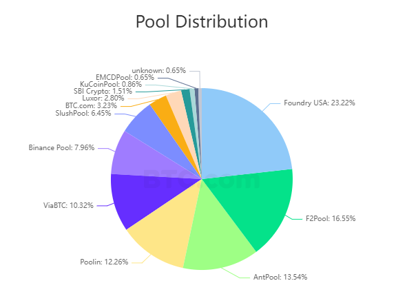 Foundry USA продолжает удерживать лидерство среди майнинговых пулов по доле в хешрейте биткоина — 23,25%. За ним в рейтинге следуют F2Pool (16,42%) и AntPool (13,43%), аффилированный с Bitmain.