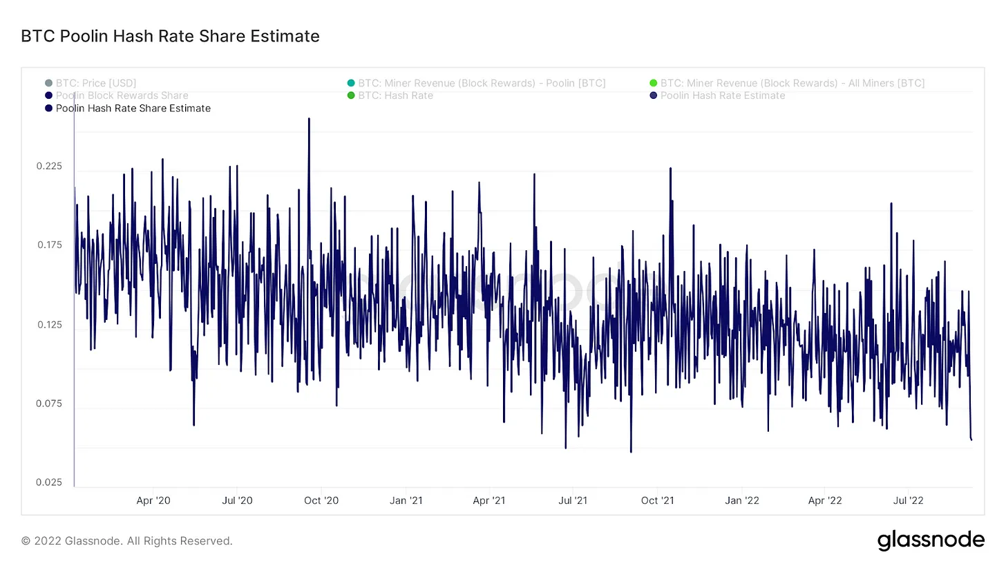 Используя данные Glassnode, мы можем взять долю Poolin в общем объеме полученной награды за блок и на основе этого оценить их долю хешрейта на ежедневной основе, что дает результат, аналогичный приведенным выше данным. Несмотря на волатильность, видно, что дневная доля хешрейта упала до 5,48%, самого низкого значения со времен введения запрета на майнинг в Китае в 2021 году.
