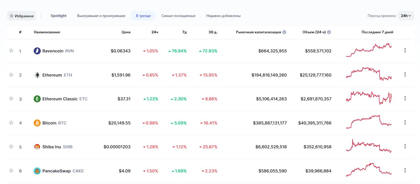 В итоге интерес к Ravencoin (RVN) резко вырос, что поставило монету на первое место в списке трендовых криптовалют, опередив Ethereum, Ethereum Classic (ETC), биткоин (BTC) и Shiba Inu (SHIB), таковы данные CoinMarketCap.