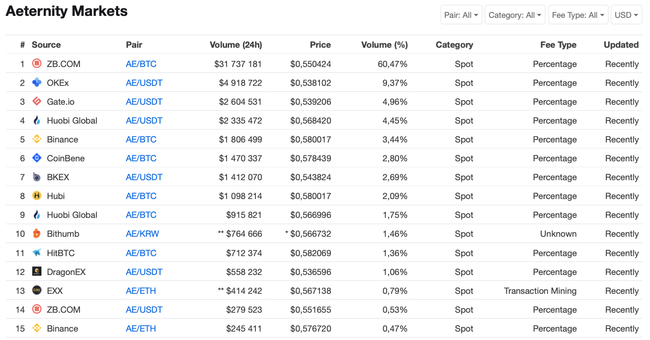 AE торгуется на многих биржах. Обладатель наибольшей доли в торгах — ZB с 60 процентами. Из более известных есть OKEx, Binance, Huobi и Coinbene.