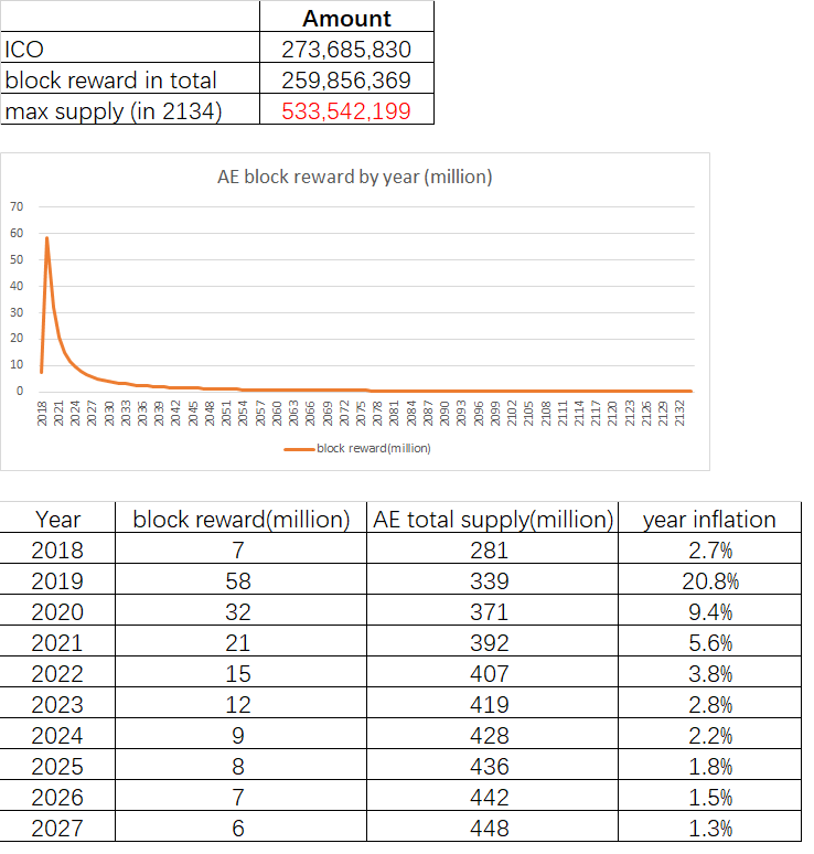 Получается, что для проведения транзакции нужно всего три секунды. Последнюю AE должны намайнить в 2134 году. В целом, ситуация с предложением и инфляцией Aeternity будет развиваться так.