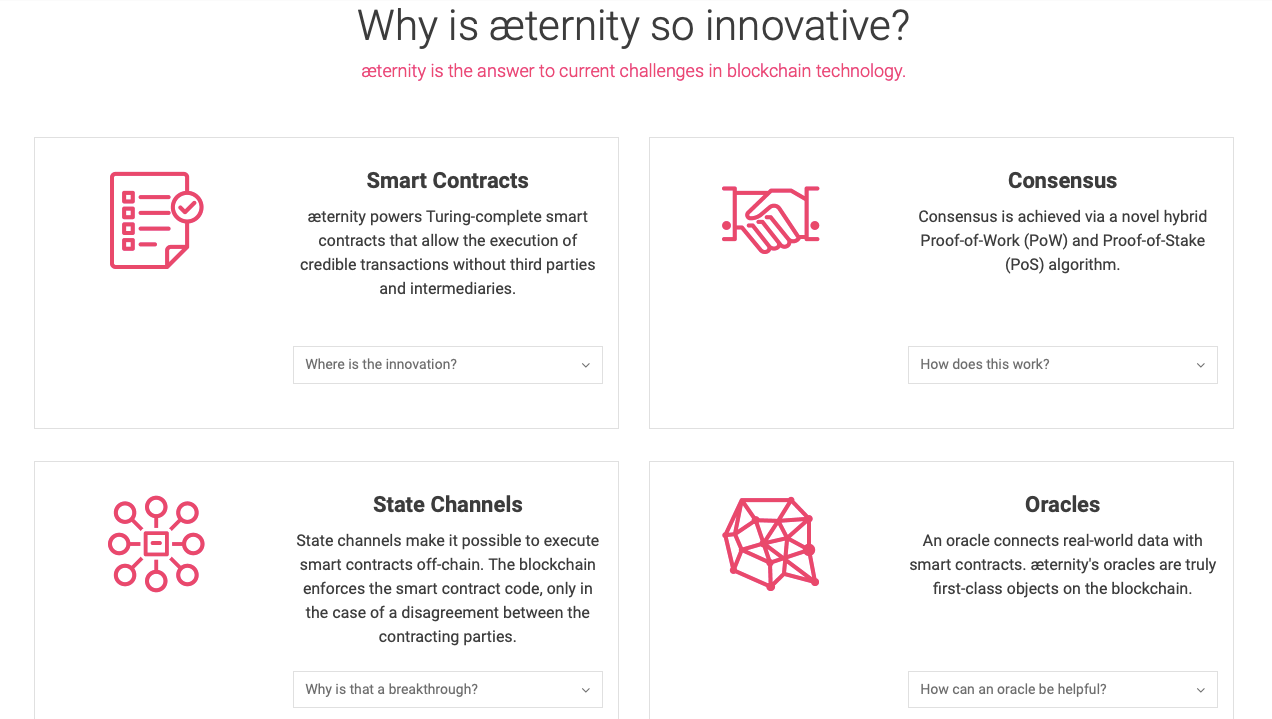 Ключевые отличия проекта разработчики перечислили в отдельном блоке информации на сайте. По их словам, æternity — ответ на все существующие вызовы, которые есть в нише блокчейн-продуктов.
