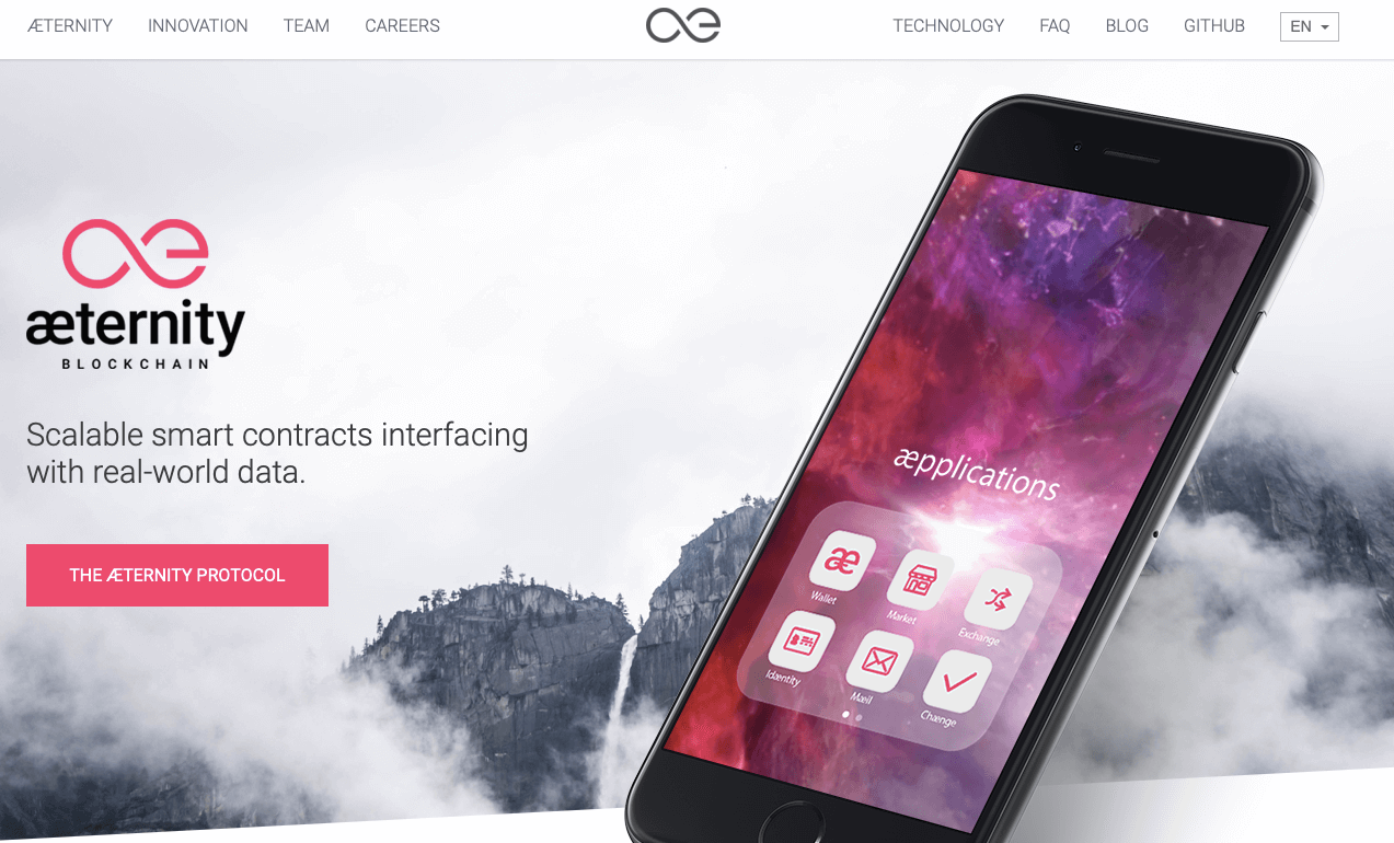 Aeternity — проект родом из 2017 года. Главная страница официального сайта тут же рассказывает о главной идее разработчиков, которую они вложили в проект. Это масштабируемые смарт-контракты для взаимодействия с данными из реального мира. Также немаленькая часть внимания приходится на децентрализованные приложения.