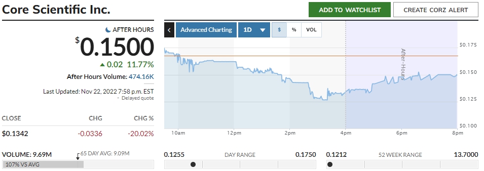 Акции Core Scientific в день подачи формы в SEC, 22 ноября, обвалились за торговую сессию на 20%, с цены открытия $0,17 до $0,134. На момент написания котировки на премаркете выросли почти на 12%, бумаги частично отыграли падение и оцениваются в $0,15.
