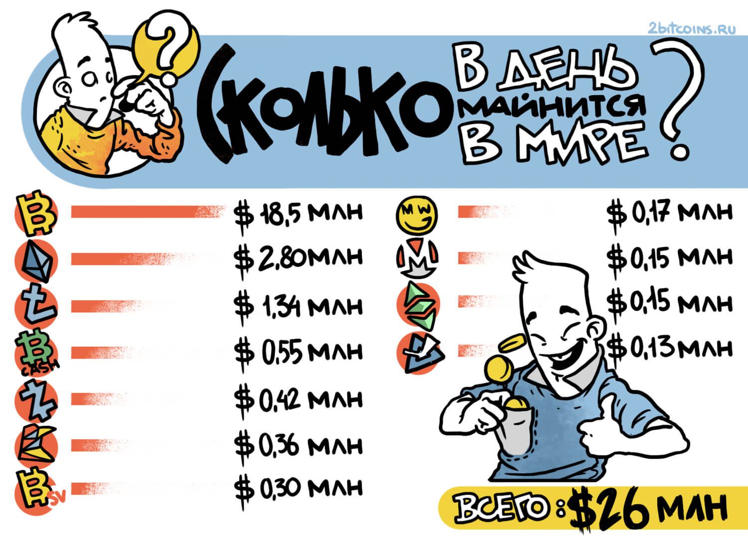 В итоге для расчёта мы взяли время блока каждой монеты, посчитали количество блоков в день и умножили их на награду за каждый блок. В Биткоине сейчас за нахождение решения дают 12.5 BTC. Последний штрих — умножить результат на актуальный курс. Отсюда и взялись миллионы.