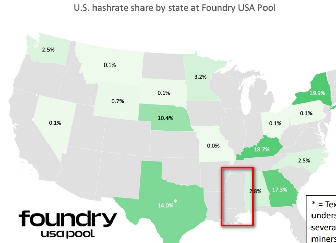 В 2021 году США вышли в лидеры по доле в хешрейте биткоина с показателем 37,8%. Однако, согласно крупнейшему майнинговому пулу Foundry USA, его участники не имели мощностей в штате.
