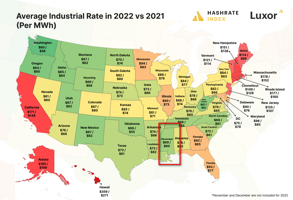 Миссисипи входит в число регионов США с относительно низкой ценой электроэнергии, согласно данным Hashrate Index. Доступные тарифы традиционно являются одним из преимуществ при выборе майнерами локации для размещения предприятий.