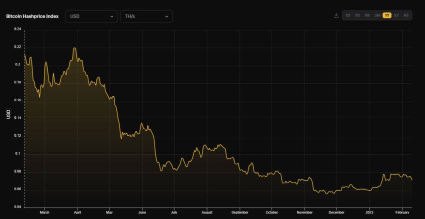 Hashrate Index называет эту метрику ценой хеша. По данным платформы, в конце ноября 2022 года она достигла исторического минимума в $0,055. Для сравнения, во время пика бычьего рынка в конце 2021 года цена кэша составляла $0,40.
