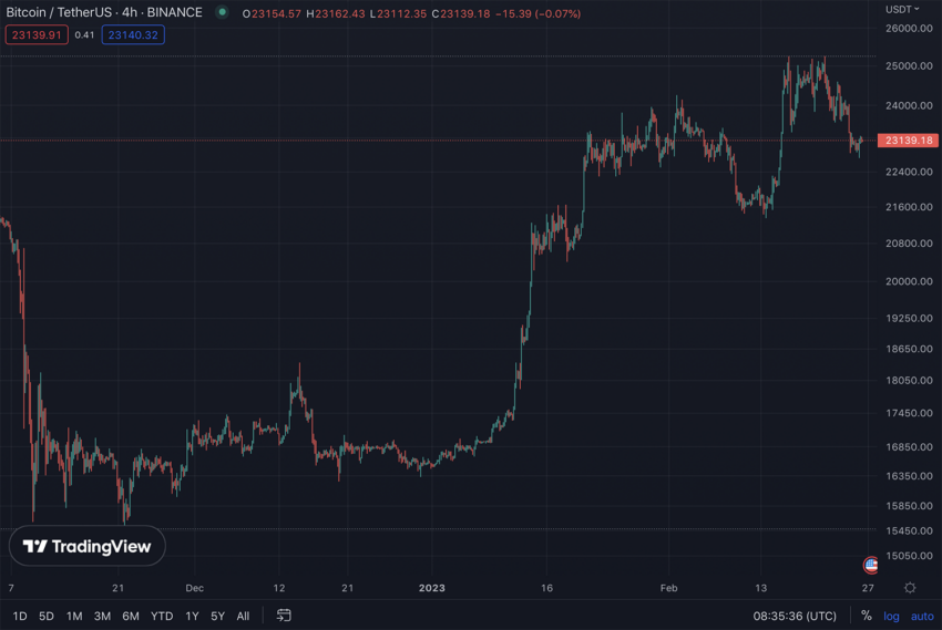 Биткоин уже несколько дней торгуется на уровне $23 000. Падение с локального максимума до текущих значений связано с январским ростом инфляции и вероятностью дальнейшего повышения процентной ставки ФРС.