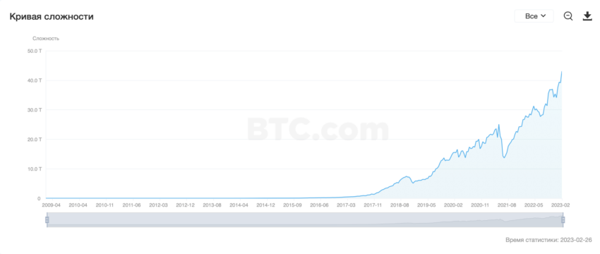 По данным BTC.com, 25 февраля сложность добычи биткоина выросла до 43,05 трлн. Это уже третий рекорд с начала 2023 года.