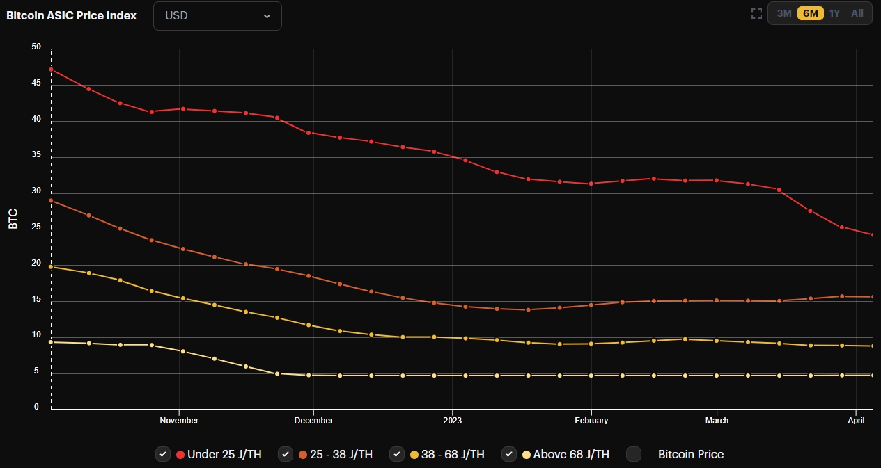 На фоне увеличения доходов майнеров в марте цены на устройства для добычи биткоина продолжили снижаться. Стоимость моделей последнего поколения за месяц упала с $31,84/TH до 25,47/TH — на 20%.