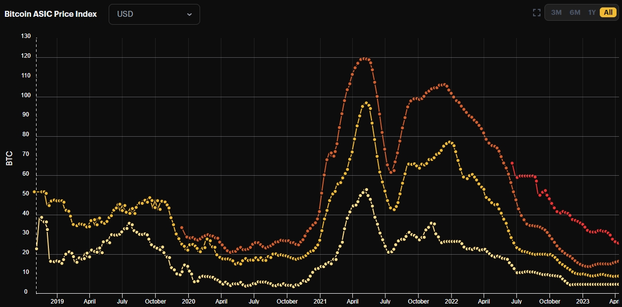 С того момента цены на биткоин-майнеры обвалились в разы. На конец сентября устройство с энергоэффективностью 25-38 J/TH стоило $98,8 за TH. В начале апреля 2023 года подобные установки продаются по $16 за TH (Hashrate Index).