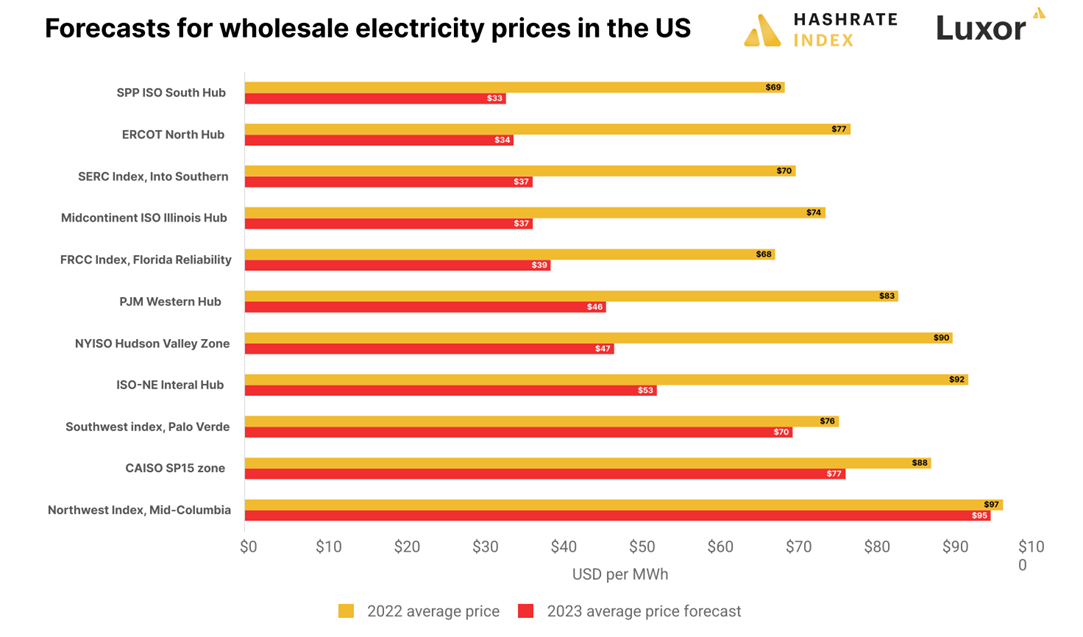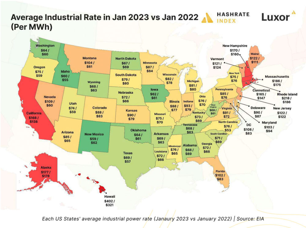 Об этом указывают данные Hashrate Index и Luxor. Рост тарифов на электроэнергию в штатах США способствовал росту затрат на майнинг. В период с января 2022 года по январь 2023 года коммерческий тариф на электроэнергию вырос в среднем на 10,71%, что выше среднего роста индекса потребительских цен на 6,4%.