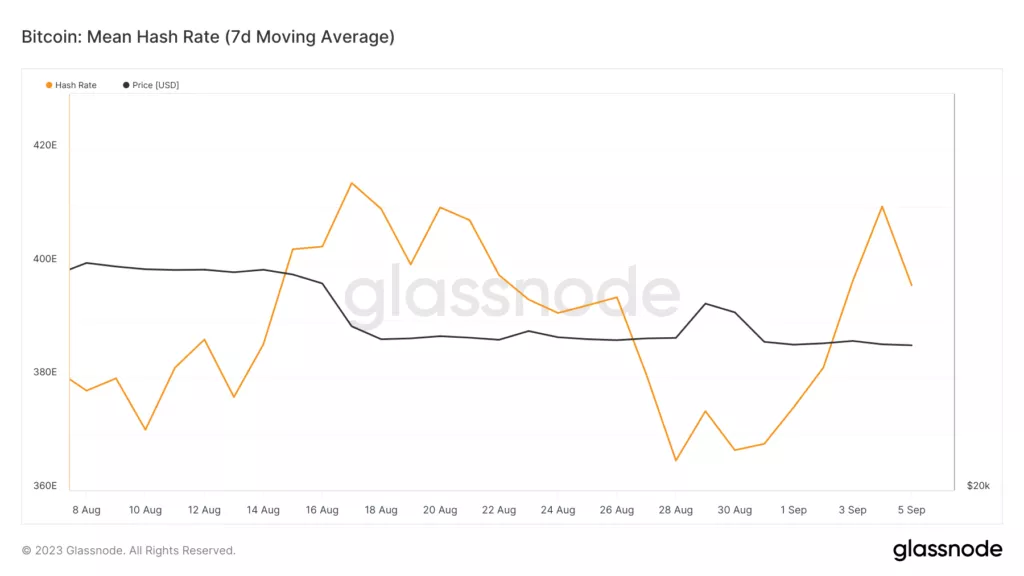 Согласно Glassnode, сглаженный 7-дневной скользящей средней показатель достиг 396,2 EH/s. В августе хешрейт превысил 400 EH/s.