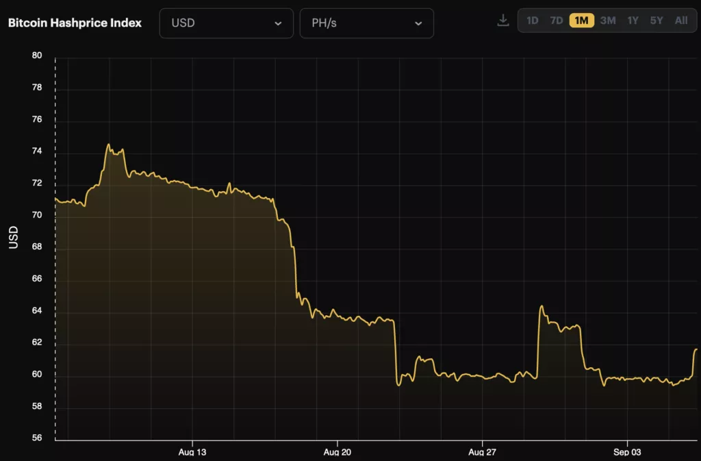 По данным Hashrate Index, за последние 24 часа хешпрайс вырос на 3% — с $59,8 за PH в сутки до $61,7.