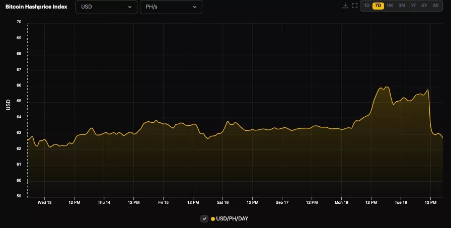 По данным Hashrate Index, за последние 24 часа хешпрайс упал — с $66 за PH в сутки до $63.