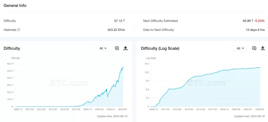 Средний хешрейт за период с предыдущего изменения значения составил 423,22 EH/s. Диапазон между блоками составил 9,5 минут.