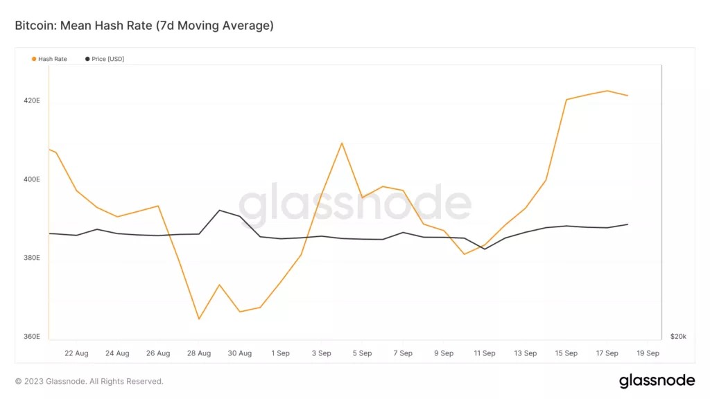 Согласно Glassnode, 17 сентября сглаженный 7-дневной скользящей средней показатель достиг максимума в 423,4 EH/s. После этого он скорректировался к отметке 422,2 EH/s.