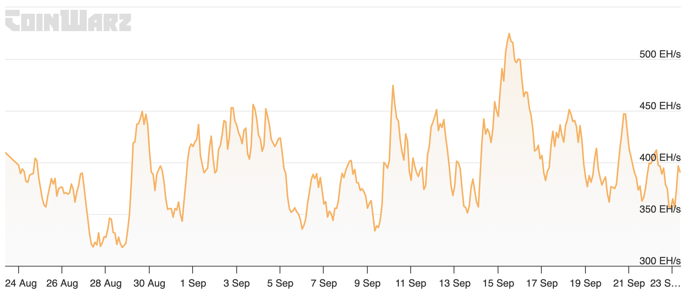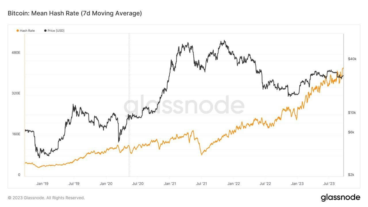 Об этом можно судить по двум показателям — хешрейту, то есть общей вычислительной мощности оборудования в сети Биткоина, и сложности добычи BTC. Первый показатель установил рекорд 15 сентября 2023 года. Тогда хешрейт добрался до отметки в 527 экзахешей в секунду, что в том числе стало первым прыжком показателя выше отметки в 500 экзахешей.