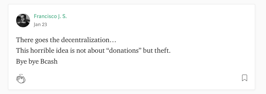 BCH вводят налог на майнеров в размере 12.5 процента. И хотя это просто смешно, блоки всех неугодных майнеров будут расцениваться осиротевшими. В прямом смысле слова — централизованный тоталитарный режим и огромная угроза атаки 51 процента.