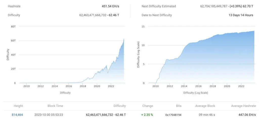 На момент написания сложность биткоин-майнинга составляет 62,46 T, хешрейт — 451.54 EH/s, согласно BTC.com.