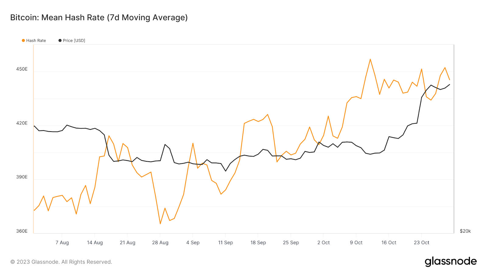 Согласно Glassnode, 12 октября сглаженный 7-дневной скользящей средней показатель достигал максимума на отметке 456,9 EH/s. После этого он скорректировался и на момент написания составляет 445,4 EH/s.