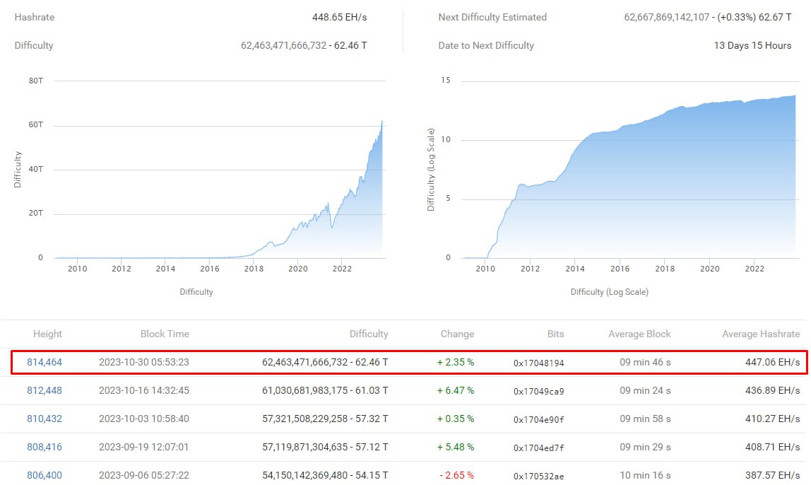 Средний хешрейт сети впервые приблизился к 450 EH/s. Диапазон между блоками составил менее 9,5 минут.
