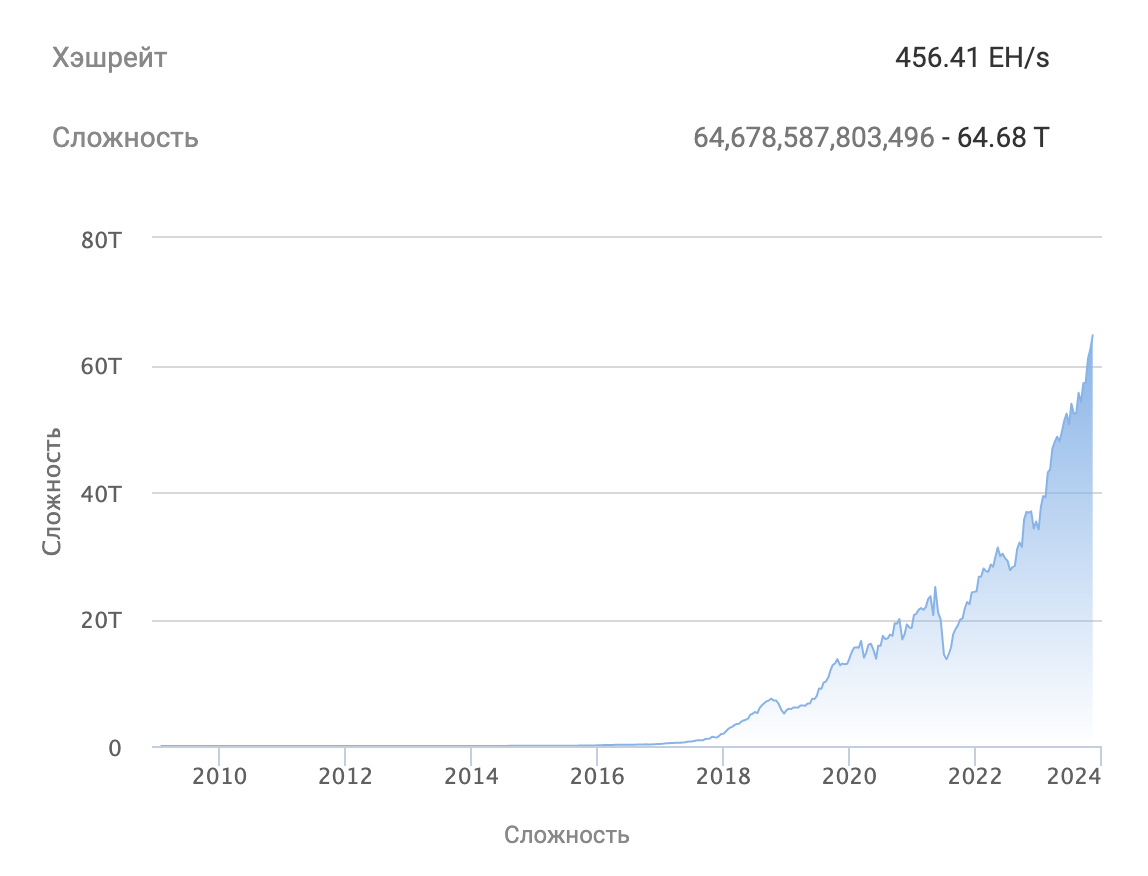 Сложность майнинга определяет объем вычислительных мощностей, необходимых для нахождения нового блока в блокчейне биткоина — сколько раз в среднем майнеры должны вычислить значение хеш-функции, чтобы найти криптовалютный блок. При текущем повышении целевое значение сложности установлено в размере 64,68 T (1 Т = 1 трлн).