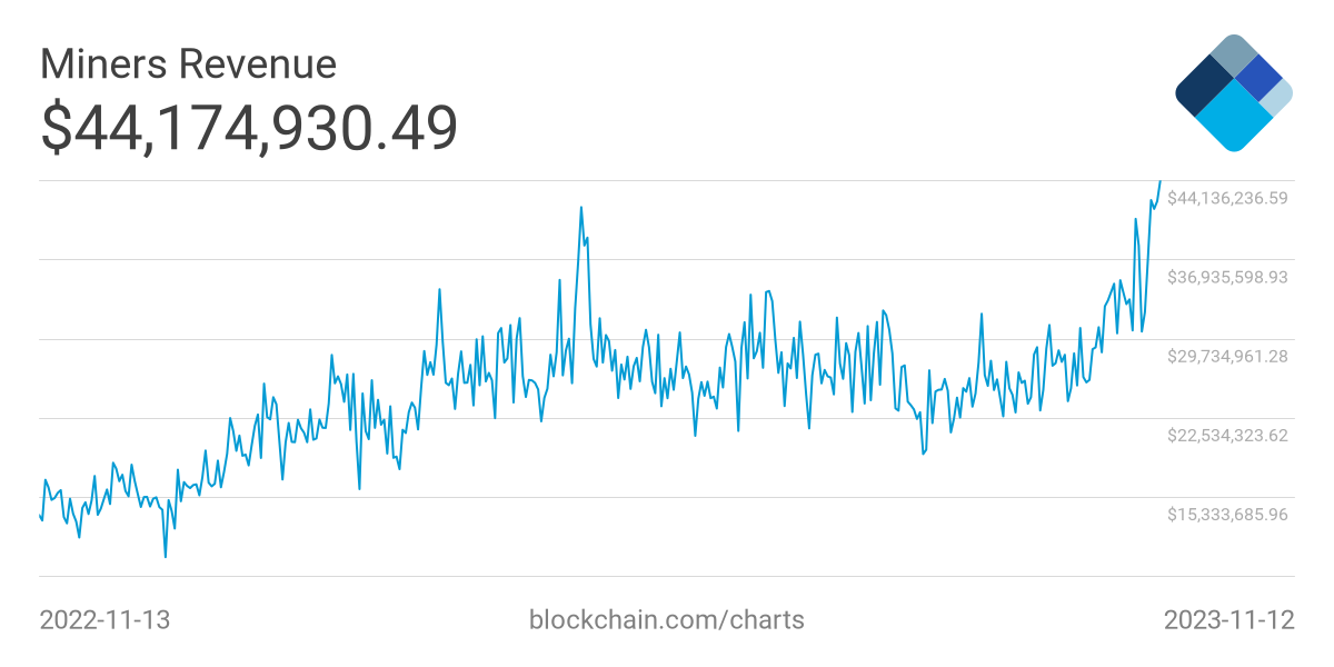 12 ноября ежедневный доход биткоин-майнеров составил около $44 млн — рекордный показатель в 2023 году. Об этом свидетельствуют данные Blockchain.com.