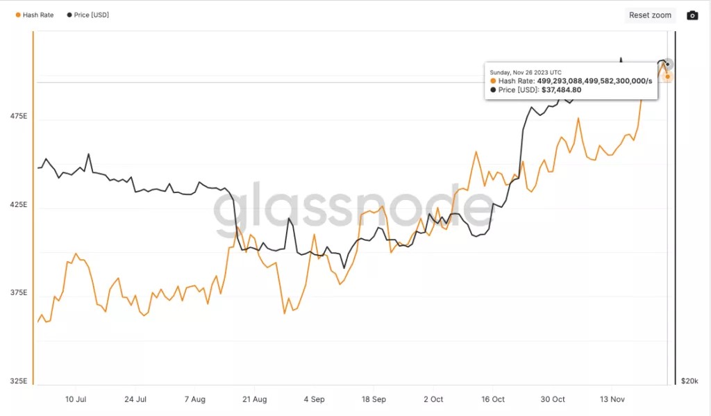 По данным Glassnode, вычислительная мощность сети на тот момент составляла 499,3 EH/s (сглаженная семидневной скользящей средней).