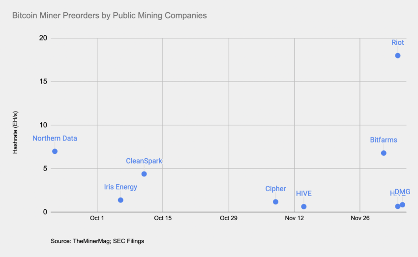 С конца сентября в число компаний, объявивших о предварительных заказах на биткойн-майнеры последнего поколения, входят Northern Data, CleanSpark, Cipher Mining, HIVE Digital, Iris Energy, Bitfarms и Riot Platforms.