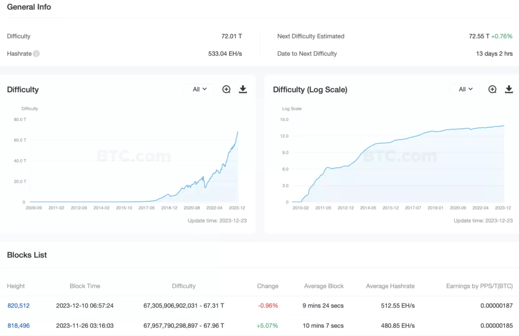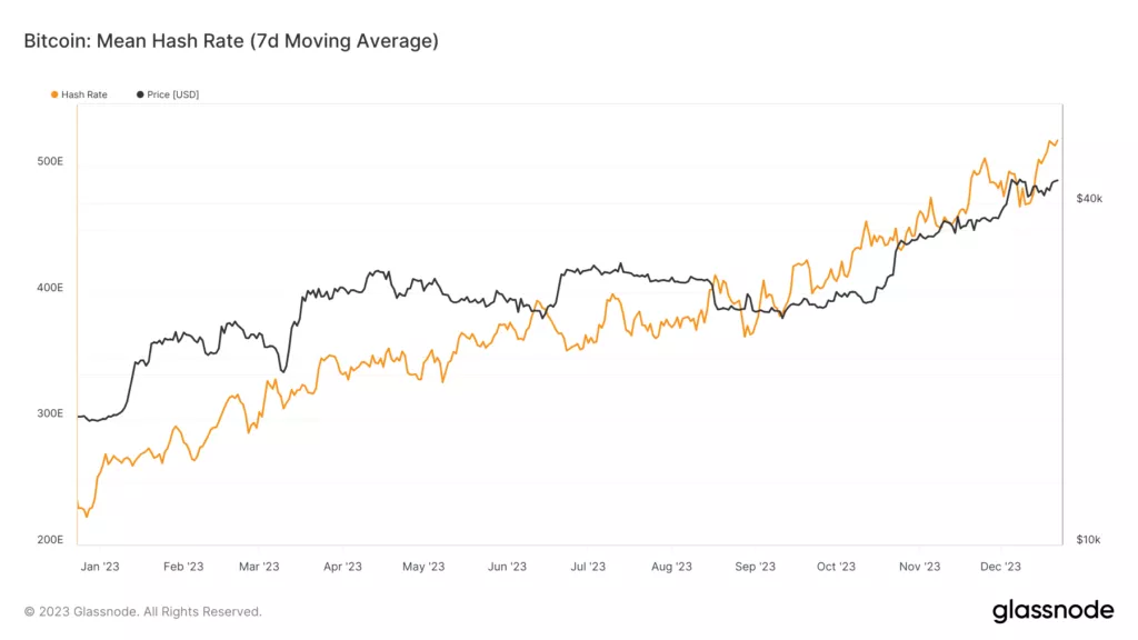 Согласно Glassnode, 22 декабря сглаженный 7-дневной скользящей средней показатель достигал 521 EH/s. На момент написания он составляет 533 EH/s.