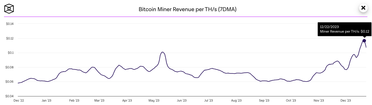 Согласно данным The Block Research, 23 декабря доходность майнинга в расчете на TH/s достигла двухлетнего максимума на отметке $0,12.