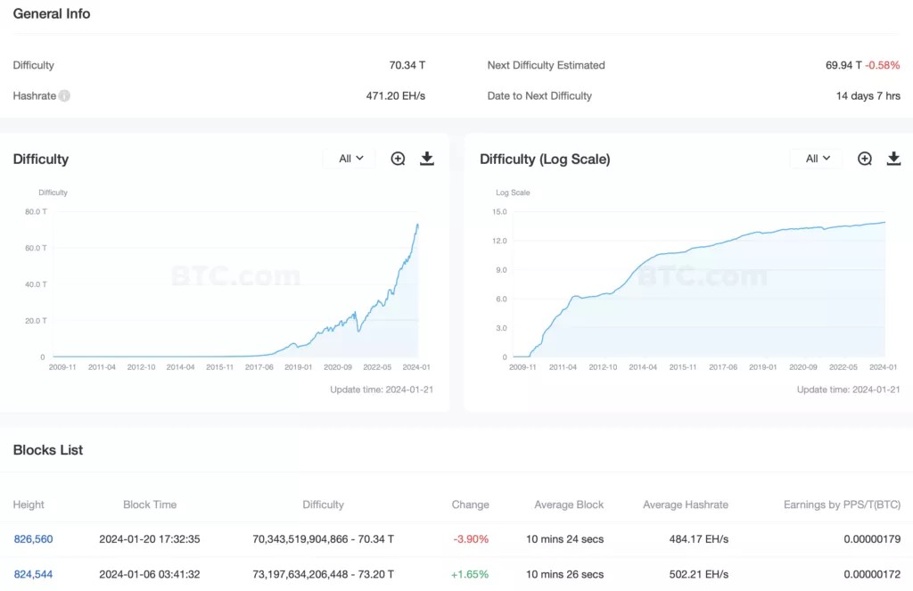 Средний хешрейт за период с предыдущего изменения значения составил 484,17 EH/s. Диапазон между блоками — почти 10,5 минуты.