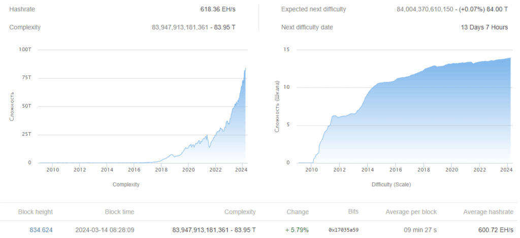 14 марта 2024 года сложность биткоин-майнинга обновила исторический максимум и достигла отметки в 83,95 T. С последней даты изменения показатель вырос на 5,79%, по данным BTC.com.
