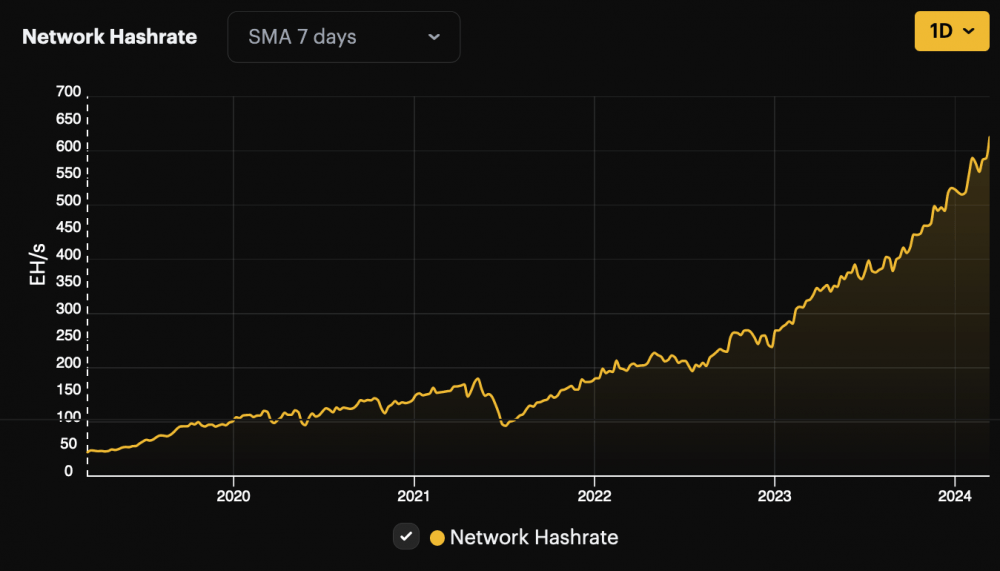 Одновременно с этим вычислительная мощность сети Биткоин взлетела до новых высот: 12 марта 2024 года был зарегистрирован пиковый хэшрейт в 628 экзахешей в секунду (EH/s) как показывает семидневная простая скользящая средняя (SMA), доступная на hashrateindex.com.