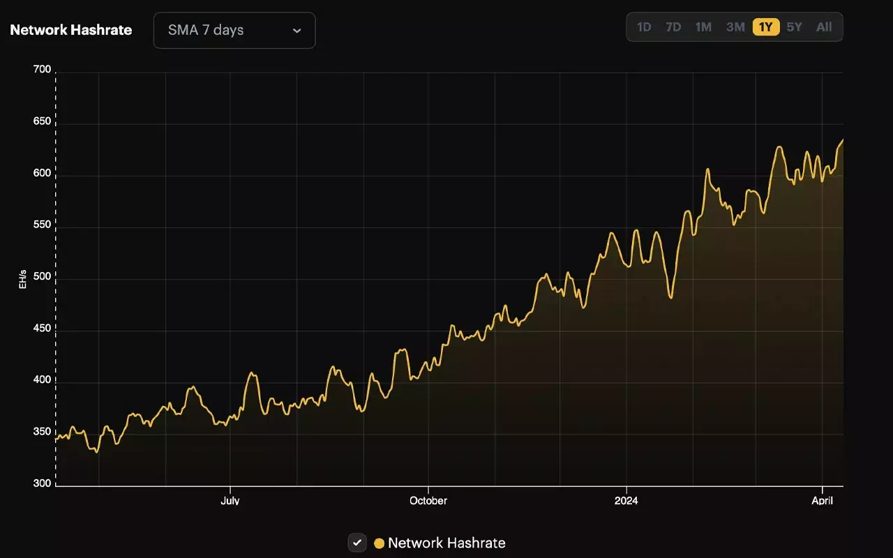 По состоянию на 11 апреля 2024 года хешрейт сети биткоина приближался к 641 Эх/с.