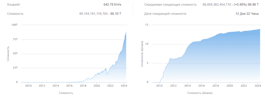 24 апреля 2024 года сложность майнинга обновила исторический максимум (ATH) на уровне 88,1 T, согласно BTC.com. Это первое изменение показателя после четвертого халвинга.