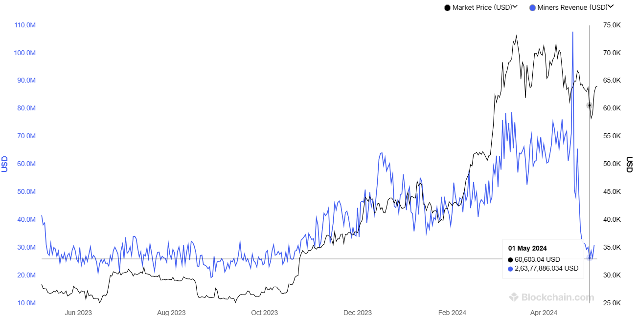 Хотя первоначальный ажиотаж вокруг халвинга и запуска Bitcoin Runes временно поддержал ежедневные доходы майнеров, в мае было зафиксировано сильное падение доходов. 1 мая общий доход, полученный от вознаграждений за блоки и комиссий за транзакции, упал до нового минимума в 26,3 миллиона долларов.