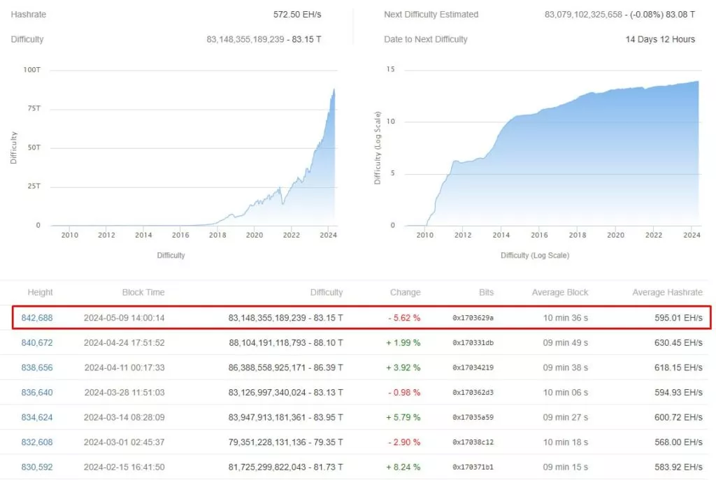 25 апреля сложность майнинга обновила максимум достигнув 88,1 T. Однако эксперты ранее прогнозировали выпадение части вычислительных мощностей после халвинга по экономическим соображениям. Оценки разнились от 15-20% у специалистов Galaxy Digital до 5-10% у соучредителя Hashlabs Mining Джарана Меллеруда.