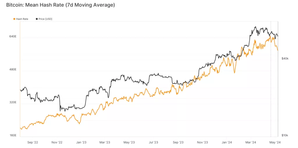 Согласно Glassnode, сглаженный 7-дневной скользящей средней хешрейт обвалился до 578,9 EH/s после рекордной отметки 649,7 EH/s на 19 апреля — минус ~11%.