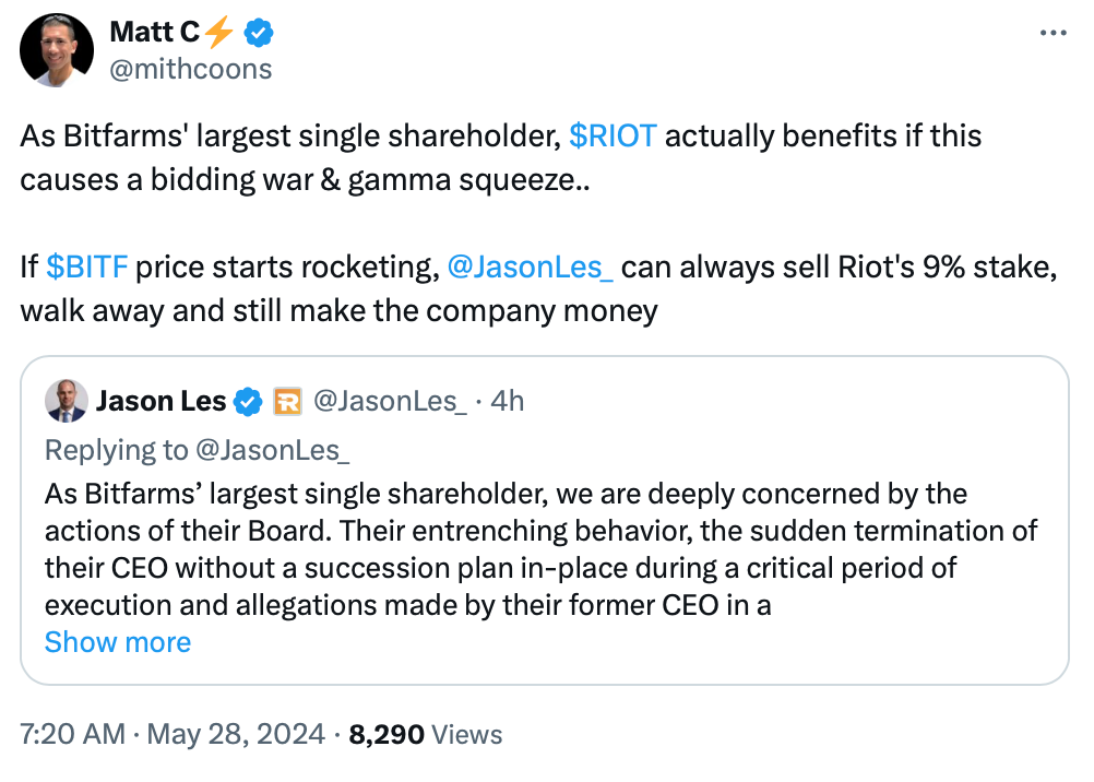 В заявлении Riot говорится, что это предложение «предоставит акционерам Bitfarms […] потенциал для создания будущей стоимости за счет участия в финансово и коммерчески более сильной компании с четко определенной стратегией, возглавляемой устоявшейся и проверенной управленческой командой».