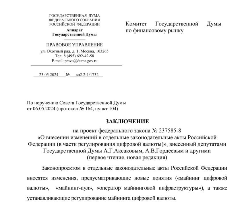 Заключение по законопроекту о регулировании майнинга и крипты в РФ. Источник: Система обеспечения законодательной деятельности